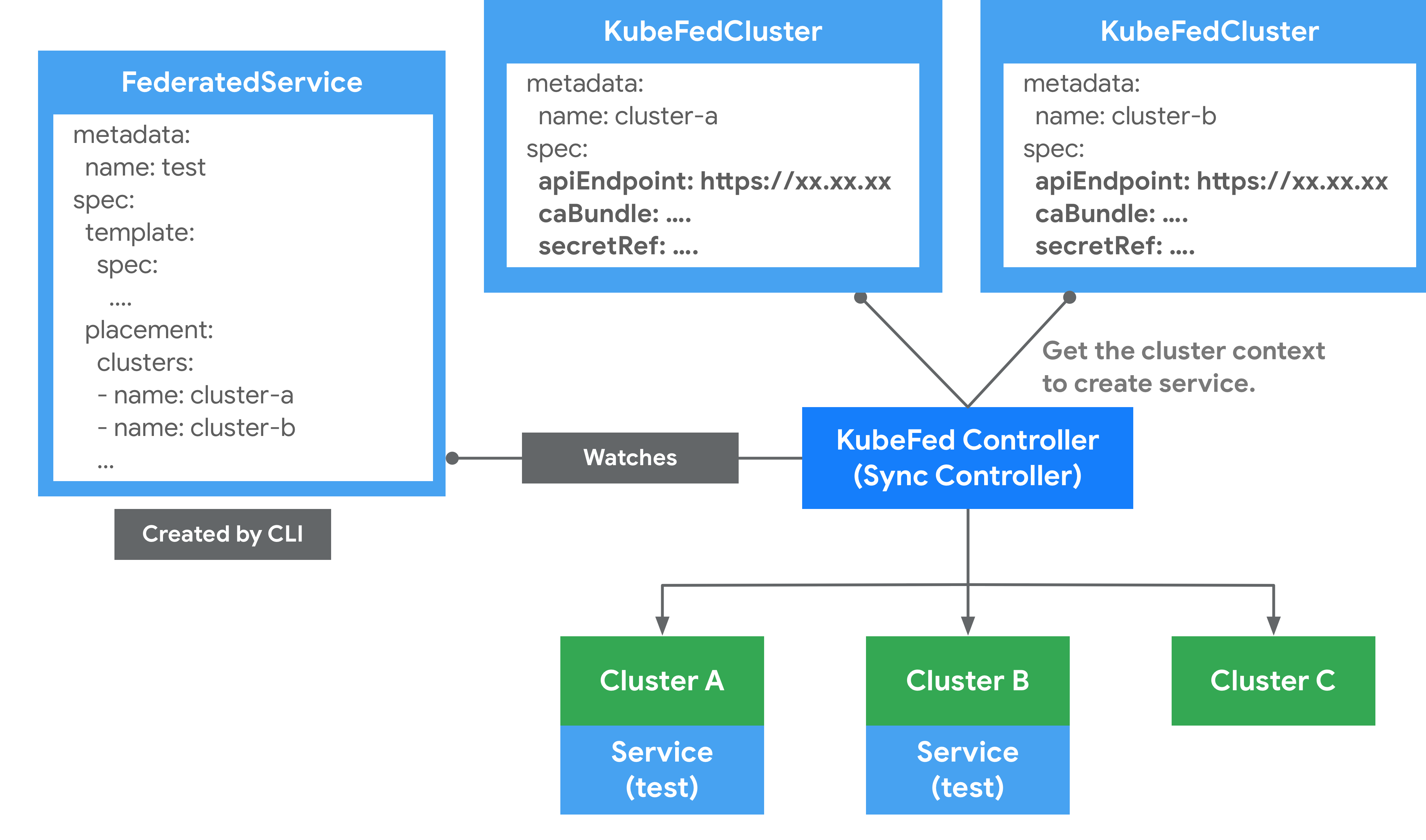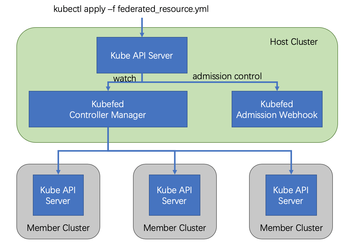 将 Federated Resource 创建到 Host 集群的 API Server 中,之后 controller-manager 会介入将相应资源分发到不同的集群,分发的规则等都写在了这个 Federated Resource 对象里面。